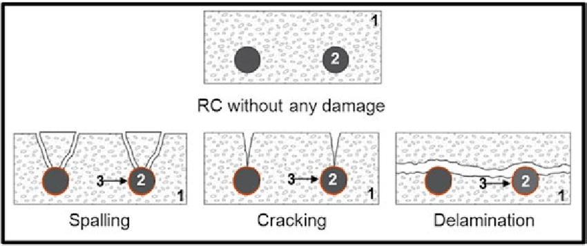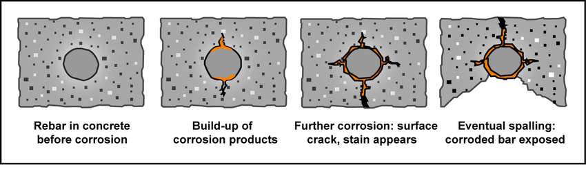 - Donatının paslanması sonucunda hacmi artar, bu da betonda iç gerilmeler oluşturur; çatlaklar açılabilir, beton parçalanabilir; bu sürece “beton patlaması” veya “spalling” de denir.